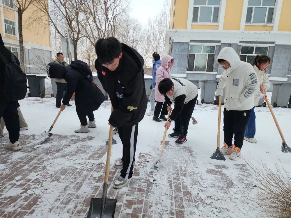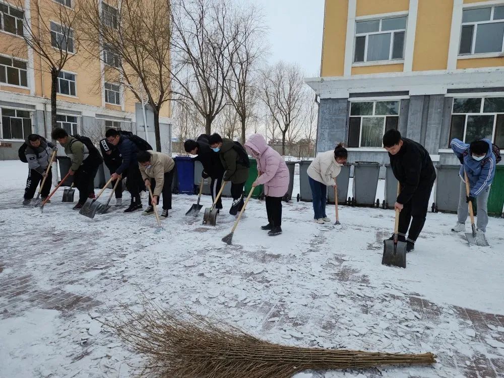 凛冽的寒风丝毫没有影响师生们的热情和工作效率,在寒冷的环境中,大家互相团结协作,不畏严寒,有序的清理道路积雪。经过师生的配合和奋力的打扫,多条通行道上的积雪情况得到解决,及时保证了校区内道路的安全畅通,为同学们的生活与安全出行带来了便捷。劳动的过程充满欢声笑语,大家乐在其中,师生队伍清扫积雪的劳动场面成了校园中一道靓丽的风景。