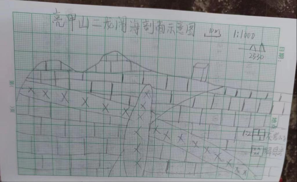 谢老师介绍此处灰岩属于海相沉积地层在海洋的200m深度沉积了大量灰岩,后期在一次岩浆活动作用下,岩浆侵入到岩层之间形成了一个岩床,又过了好长时间,又一次的岩浆活动,岩浆沿着地层之间的裂隙侵入,冲断了岩床从而形成了一个穿插岩床而过的岩墙。抬头看向亮甲山,两个非常醒目的墨绿色侵入体,一个顺层侵位到亮甲山组内部为岩床,一个以岩墙方式贯入冶里组和亮甲山组之中。谢老师戏称这里为“二龙闹海”。在这,谢老师教授学生绘制亮甲山“二龙闹海”剖面示意图。
