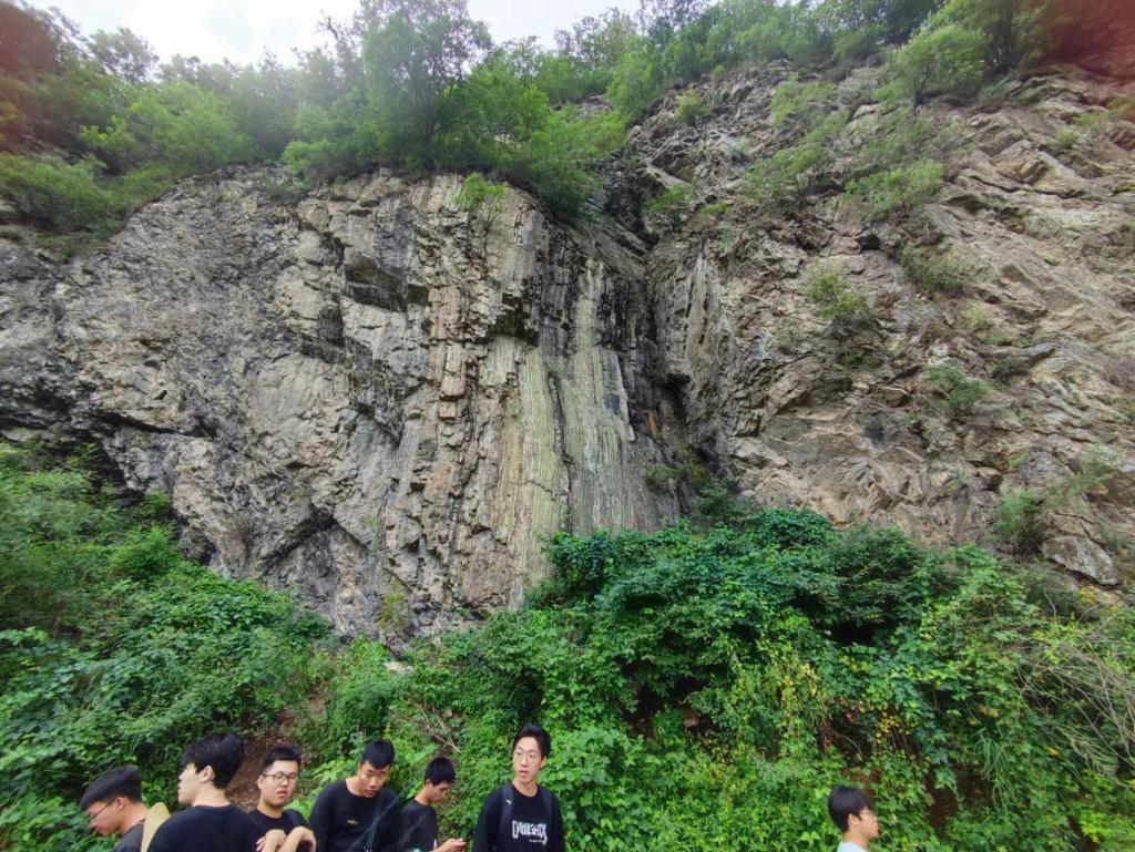 从吴庄前往大石河支流(也称为花场峪河)的途中,看到了“山崩地裂”。姜老师解释到:此处水平沉积的岩层受到构造应力后断裂,上方岩石掉落到形成的大裂缝中,称为“山崩地裂”。