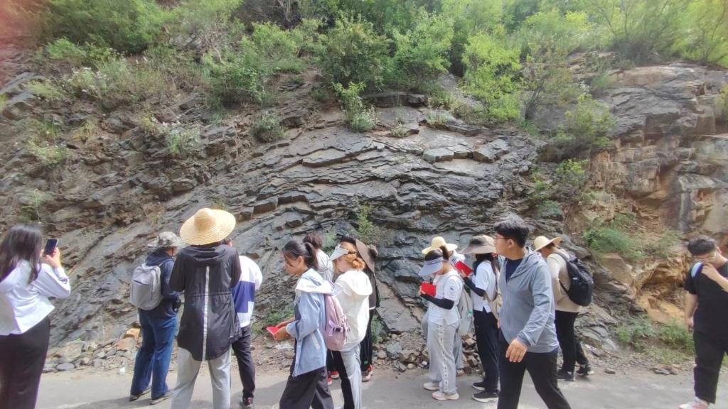 来到今天第三个地质观测点:吴庄。此观测点可见亮甲山组黄斑豹皮灰岩与张夏组鲕粒灰岩,此处二者之间存在地层缺失,判断为断层构造。继续前行可见多组保存完好的背斜与向斜,由于其形态称为“九龙壁”。