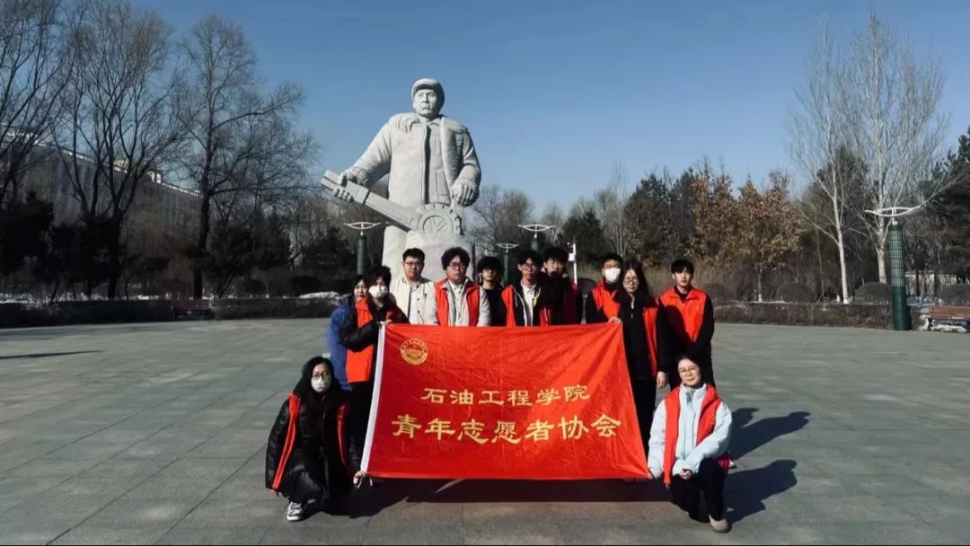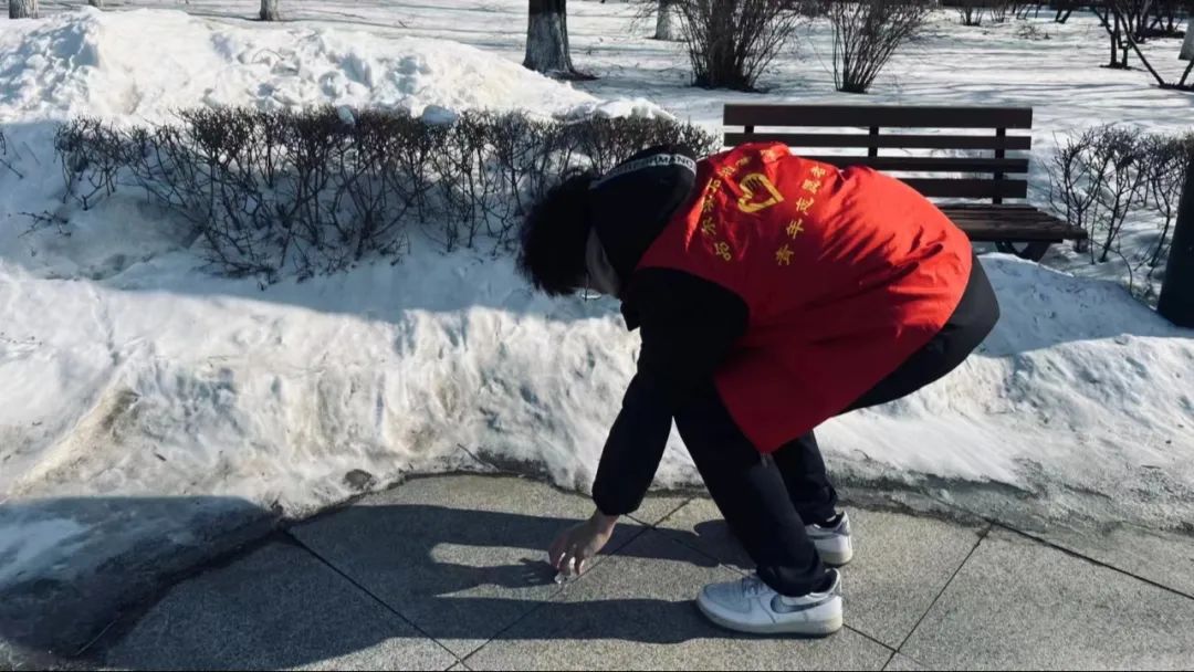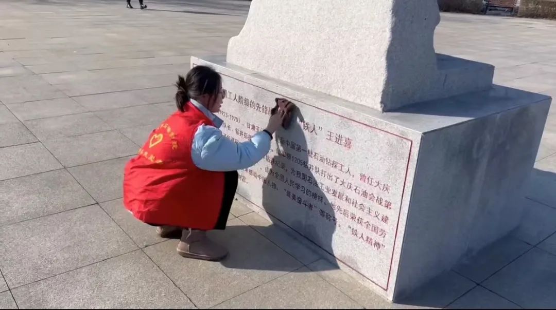 活动伊始,志愿者们手持清洁工具,不畏严寒,分工合作,清扫王进喜铁人雕塑周围的地面余雪,拾捡起地面的垃圾碎屑,每个人都以最认真的态度投入到这次活动中。志愿者们不仅打扫了王进喜雕像广场的卫生,还对周边的设施进行了细致的清洁,细心地擦拭着铁人雕像,确保每一位同学在休息时都能感受到清洁与舒适。在志愿者们的带动下,整个广场呈现出一片繁忙而有序的景象。王进喜铁人雕塑的干净整洁不仅彰显着雷锋无私奉献、服务社会的精神,更使同学们在观赏的同时感受到王进喜铁人向我们传递的不怕吃苦、克服困难的精神。