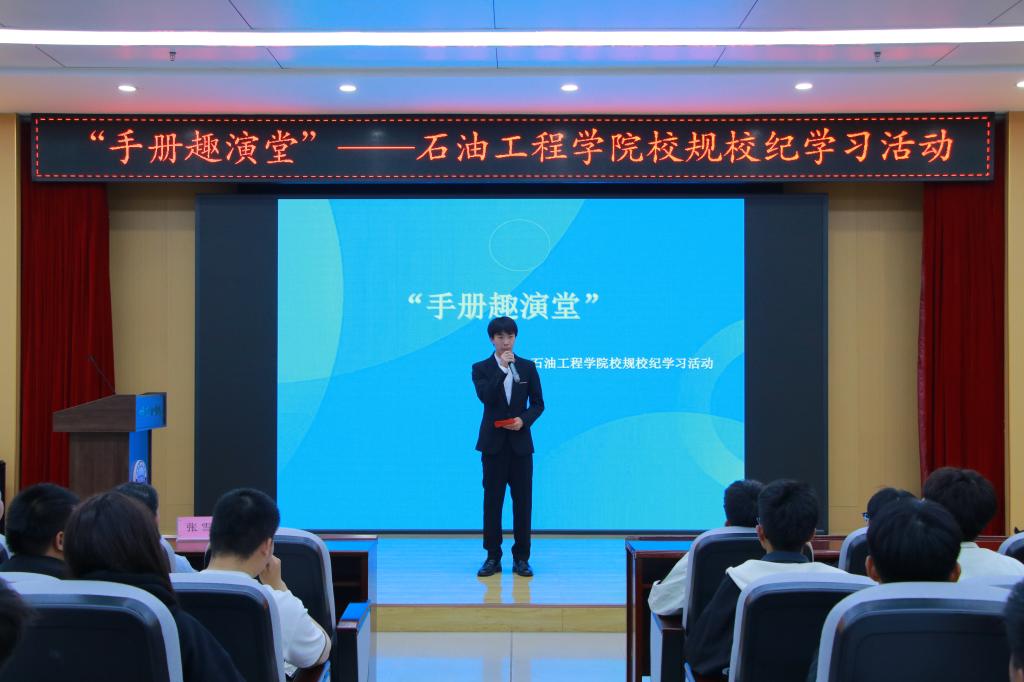 活动中石油工程学院的同学们通过实际的表演,将学生中典型违纪事件被逐一搬上舞台。例如,在一个关于考试作弊剧本中,表演者重现了一名学生如何存在侥幸心理考场作弊被抓的场景,最终给予处分;在寝室中如何从一场看似普通的争论中升级为肢体冲突,最终两败俱伤。表演者们不仅仅是复现了事件的发生过程,还进一步展示了学校如何介入,进行调查教育,并根据《学生手册》相关规定来执行相应的纪律处分。每个案例表演结束后会根据《学生手册》对应条款进行解析提问,现场同学参与热情高涨,气氛热烈。