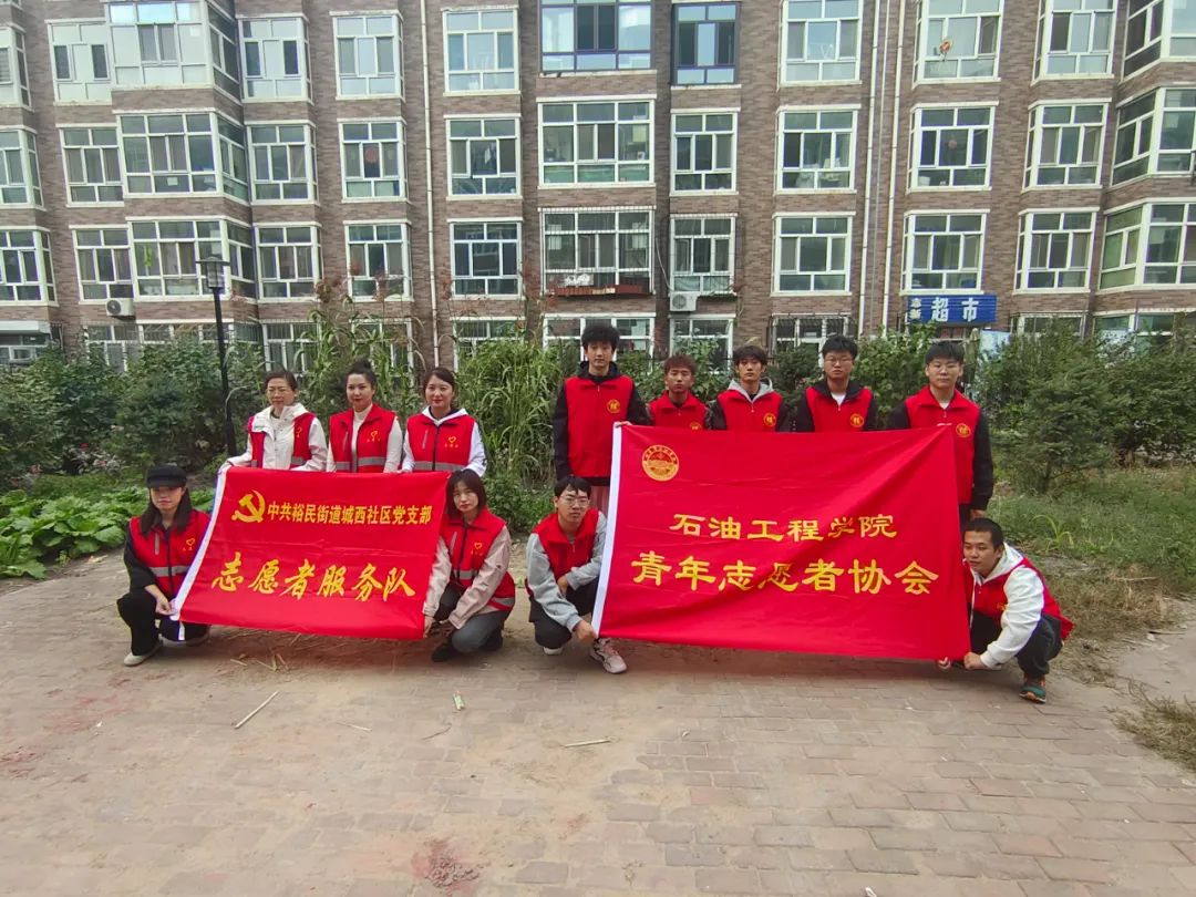 在国庆佳节即将来临之际,为营造整洁、优美的社区环境,增强社区居民的生态文明观念和环保意识。石油工程学院于9月24日联合城西社区,开展了一场以 “以行动绘就绿色画卷,用爱心铸就生态长城” 为主题的进社区环境整顿活动。本次活动由石油工程学院青年志愿者协会全体成员参与。
