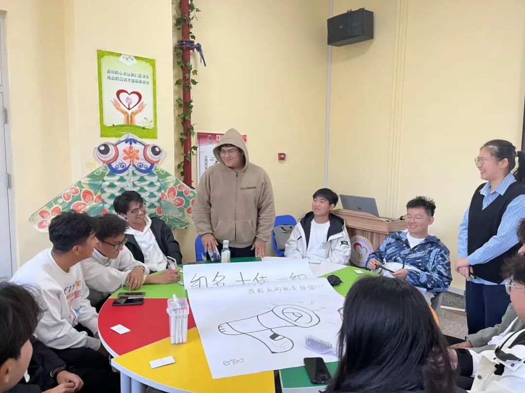 活动上,叶老师针对当代大学生的心理特点以及易出现的心理问题,结合当下热点话题,用幽默诙谐的语言,带领同学们进行了一次探索自己内心世界的旅行。首先,叶老师让大家自行组队,通过讨论设计队名及队徽,选派一名同学对队名和队徽的设计理念进行阐述,培养学生们的集体意识。