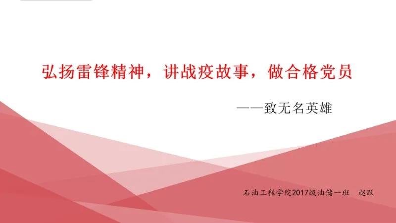 活动上,六位学生党员逐一分享了:张定宇隐瞒身患渐冻症绝症的病情,不顾感染新冠肺炎的妻子,坚守在抗击疫情的最前沿;“疫情不散,婚礼不办”、“我还年轻,我先上”、“配合治疗,好了再回一线”,年仅29就牺牲在抗疫一线的彭银华医生;发扬“让我来”精神的急诊科护士杜富佳,将医院视为战场,不计个人得失,做好自己的工作职责;84岁的钟南山院士昼夜兼程赶往武汉,始终战斗在疫情的最前线;李兰娟院士从曾经的赤脚医生到如今的业界知名专家,始终奔走在医学最前线,做实事、说真话以及许许多多奋战在一线的医务工作人员和平凡岗位上努力奉献的工作者的战“疫”事迹。