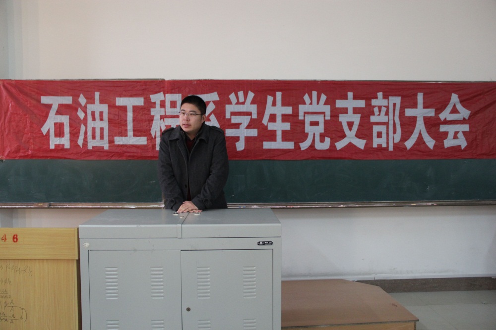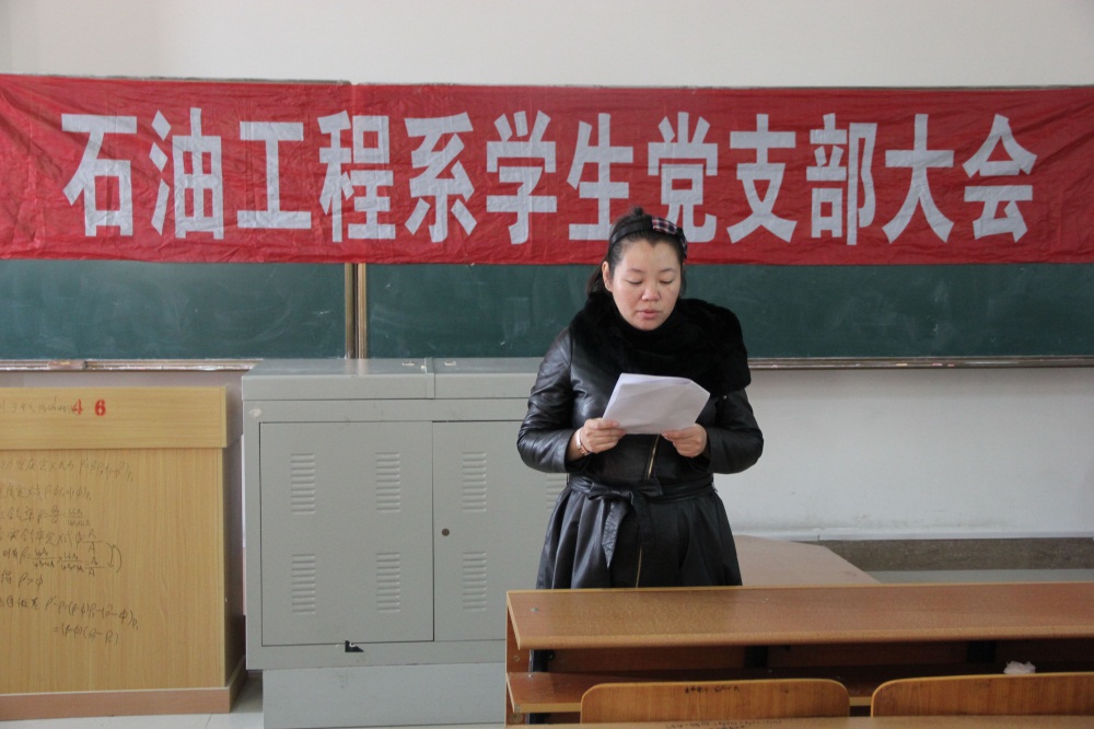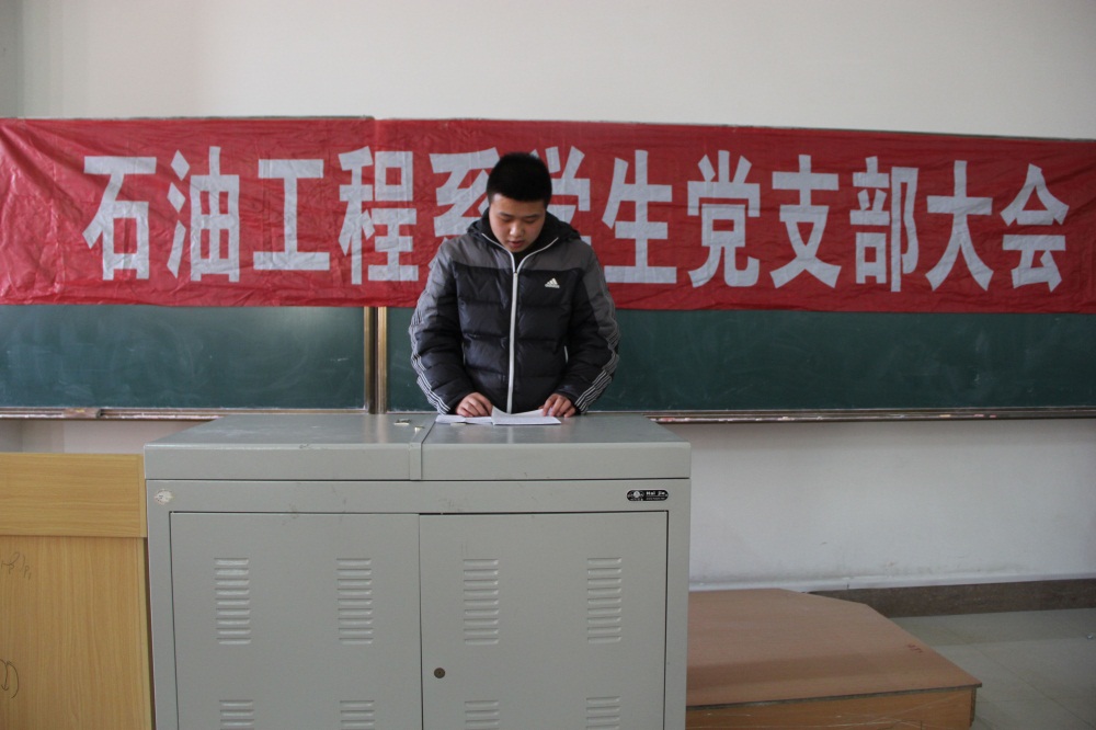 11月17号下午13点,石油工程系学生党支部在主教426召开全体大会,集体讨论关于马立志等12名预备党员转正问题和李伟等17名新发展预备党员的接收问题。党总支书记毛雷出席本次大会,系学生党支部书记张雪主持会议。