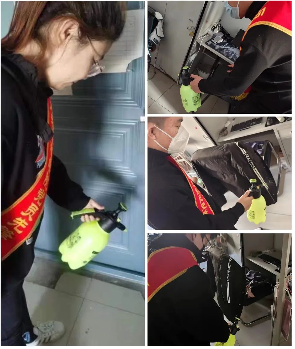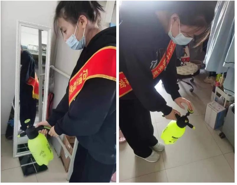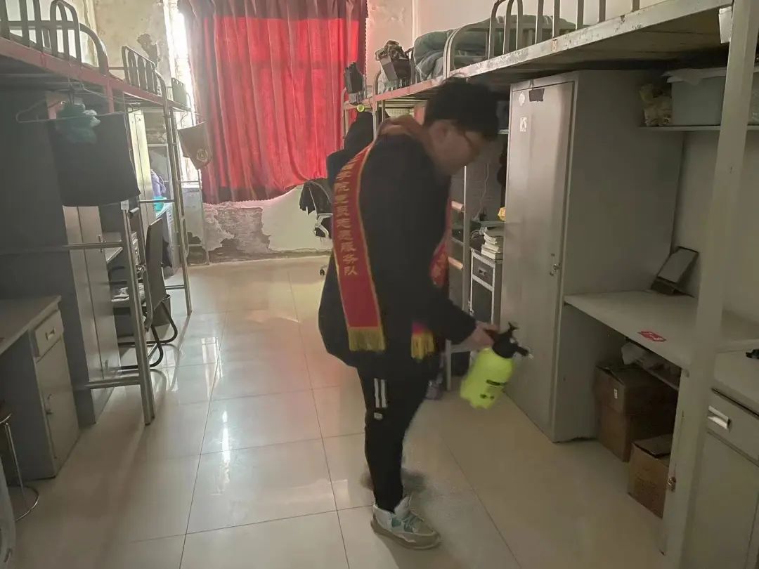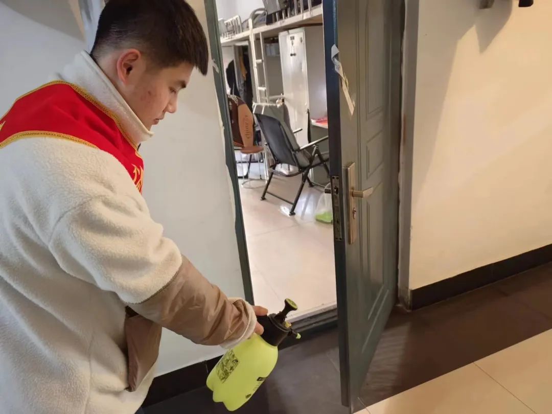 在消杀过程中,同学们分工明确,积极配合消杀工作,严格遵守防疫要求对寝室进行全方位、无缝隙、无死角的消杀。在消毒过程中,对学生寝室地面,走廊,门口等区域进行全面消毒,确保不留死角。同时,学生党员们还不断提醒同学们注意寝室卫生的打扫,及时倾倒垃圾,加强室内通风,保持疫情期间心情舒畅。同学们也积极配合寝室消毒工作,本次寝室消杀工作顺利完成。