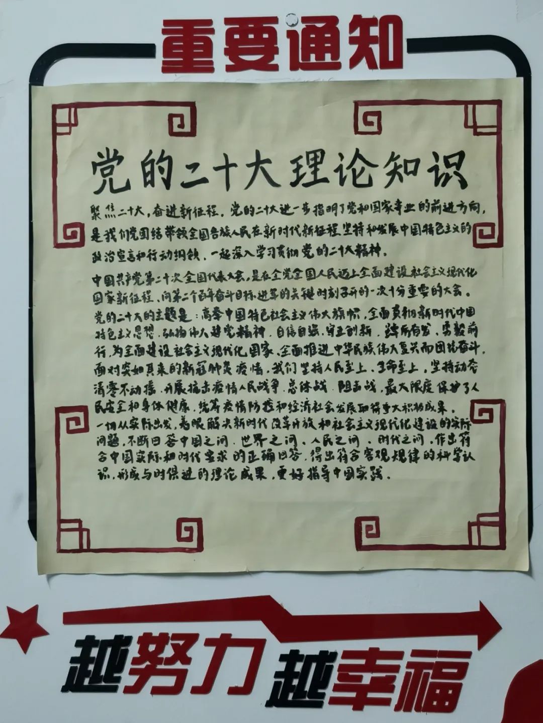 为深入学习宣传贯彻党的二十大精神,进一步进行爱党爱国爱社会主义教育,感悟时代脉搏,厚植爱国情怀,激励青年党员攻坚克难、开拓奋进,将党的二十大精神体现到工作实处,11月28日,我院开展以“学习党的二十大精神”为主题的专栏海报活动,通过宣传海报的形式,推动党的二十大精神入脑入心。