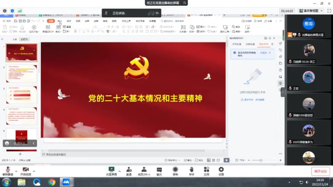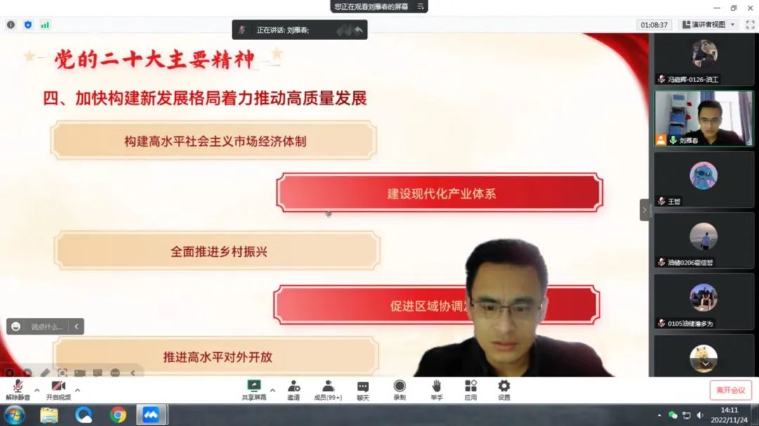 最后,刘书记希望同学们能在今后的课程中学会通过多种形式,活学活用二十大精神,教育同学们要听党话、跟党走,能具备爱党报国、敬业奉献、具有突出技术创新能力、善于解决复杂工程问题的复合型、战略性人才,通过注重个人成长、成才、成功与国家重大发展战略需求的统一,也更加需要战略人才聚焦解决世界经济、科技、健康等领域的热点难点问题,切实维护国家和世界的和平稳定,让青春在全面建设社会主义现代化国家的火热实践中绽放绚丽之花。