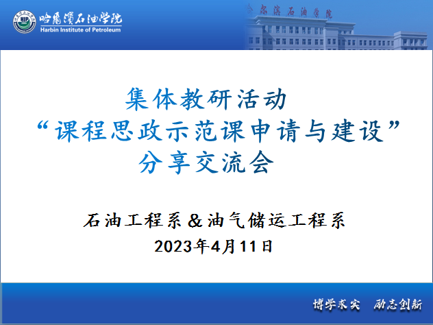 2023年4月11日13:00,我院石油工程系联合油气储运工程系举办 “课程思政示范课申请与建设分享交流”集体教研活动,由曾参与申报课程思政示范课的两门课程——《钻井工程》、《油藏工程》的负责教师李岳祥院长、张国芳老师分别进行经验分享。