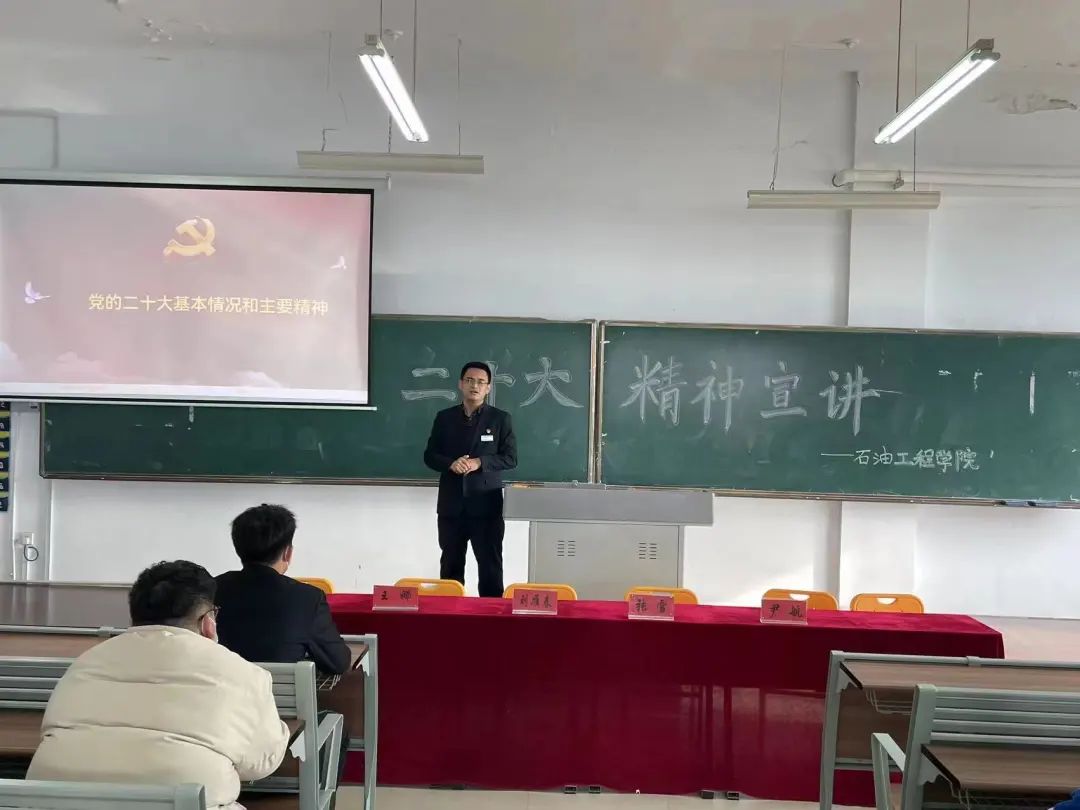 理论宣讲是传播党的创新理论的有效途径,是富有特色和成效的“大思政课”。万博官网石油工程学院党总支按照学校党委的要求和部署,成立二十大精神宣讲团,形成了以领导干部带头宣讲、优秀党员示范宣讲、教师课堂宣讲、辅导员教育宣讲和学生骨干朋辈宣讲的多层级、立体式宣讲体系。宣讲中,石油工程学院党总支号召全体党员通过认真学习领会党的二十大精神,能自觉将二十大精神贯彻到日常学习工作中去,宣讲队成员紧扣重点宣讲内容,巧抓宣讲受众特点,以“围绕中心工作,联系实际”的宣讲效果,把党的二十大精神讲清楚、讲明白、讲深入、讲生动,把学习宣传贯彻党的二十大精神与学习贯彻习近平总书记关于教育的重要论述、与落实立德树人根本任务结合起来,切实将党的二十大精神学习成效转化为推动学院高质量发展的不竭动力,奋力谱写新时代新征程学校教育改革发展新篇章。通过宣讲深入开展二十大精神学习宣讲活动,切实保障学习成果入脑入心。