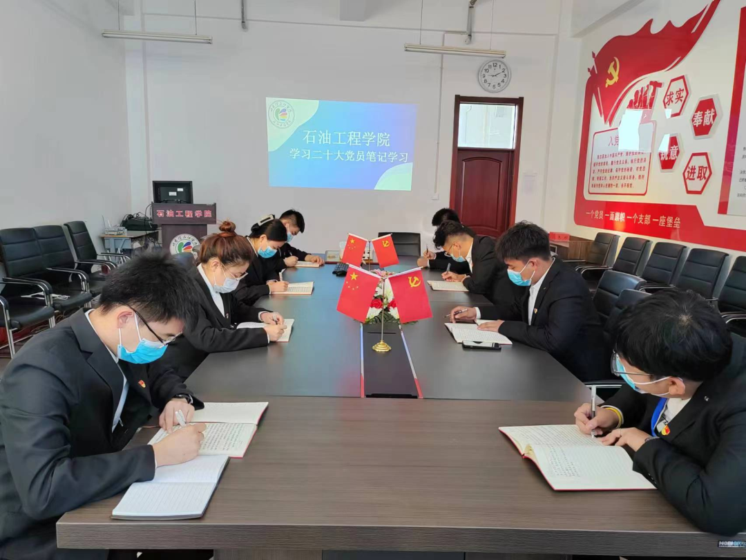 党的二十大开幕当日,学院党总支组织全体党员干部、师生以多种形式收听收看大会开幕会盛况,第一时间聆听、学习党的二十大报告。随后,分别召开党总支(扩大)会议、专题学习会议,原原本本学习党的二十大精神。学院领导班子带头领学、带头发言、带头抄写学习笔记,以上率下。各基层党组织通过党员大会、“三会一课”等形式,原原本本、逐字逐句研读党的二十大报告,交流心得体会。学院党总支书记刘雁春强调,石油工程学院党总支将学习宣传贯彻党的二十大精神作为当前和今后一个时期首要政治任务,坚定拥护“两个确立”,增强“四个意识”、坚定“四个自信”、做到“两个维护”,以昂扬的精神状态和扎实的工作作风把党的二十大提出的目标任务落到实处,确保党的二十大精神在石油工程学院党总支落地生根。要把全院师生的思想和行动统一到党的二十大精神上来,把力量凝聚到党的二十大确定的各项任务和学院高质量跨越式发展上来,以一流的业绩呈现学习成效。截至目前,学院各级党组织已开展专题学习12次,全院领导干部、党员教师、学生骨干积极学习,努力推动学习走深走实。