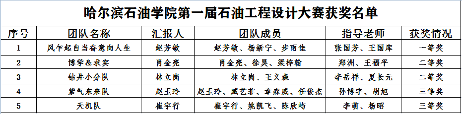 参赛队伍汇报结束后,评委老师对本次石油工程设计大赛进行了点评:石油工程设计大赛是全国性的专业比赛,通过本次竞赛不仅能够让学生将课堂上学到的理论知识运用到实践中,更重要的是学会发现问题、分析问题和解决问题的思路与方法。本次大赛最终决出一等奖1名、二等奖2名、三等奖2名。获奖团队名单如下: