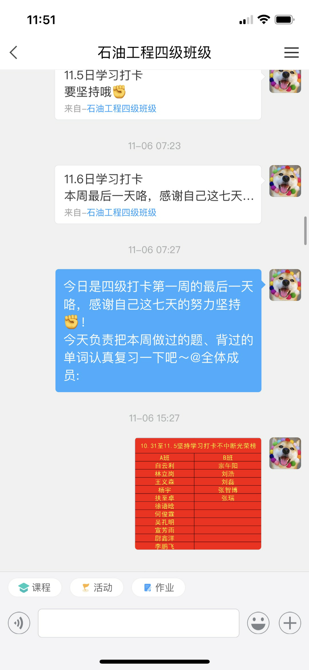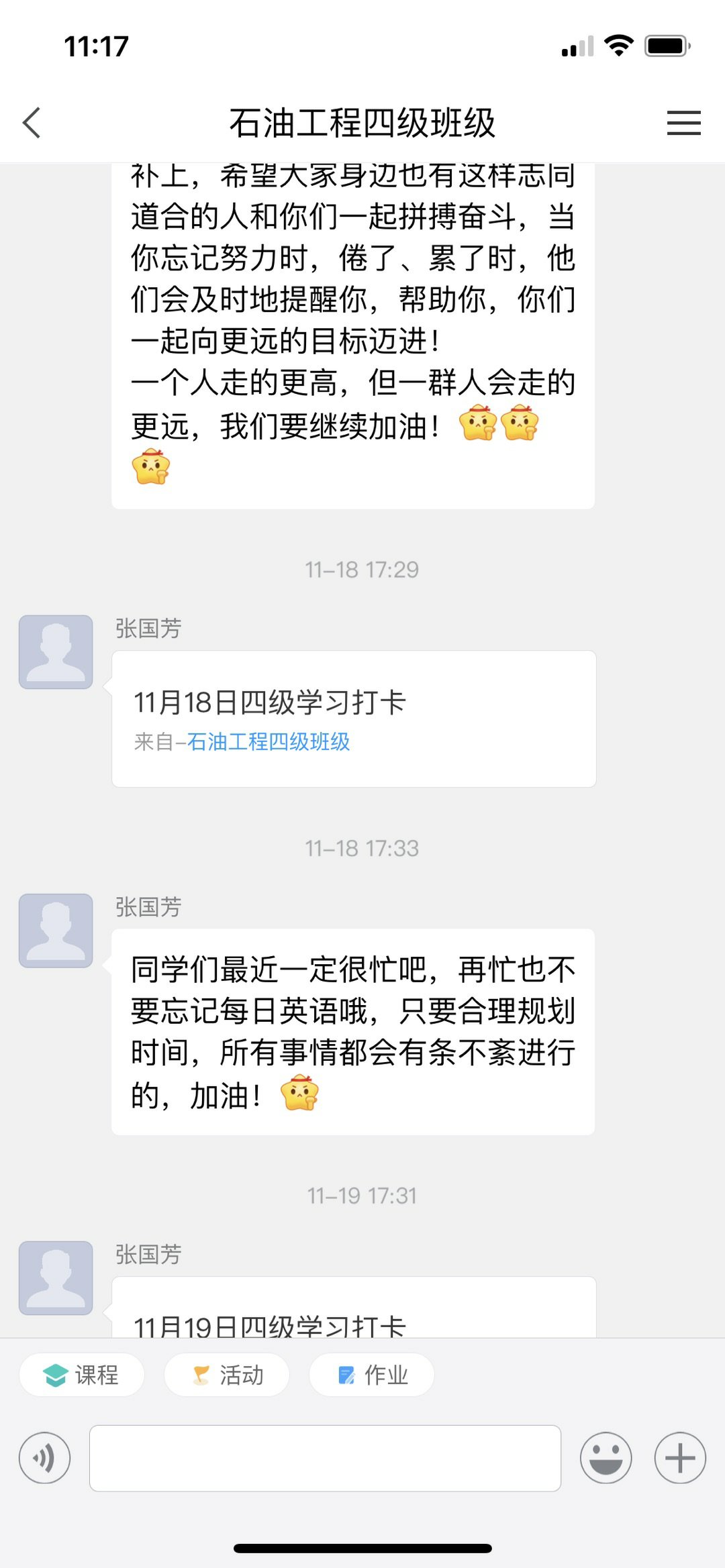 该活动目前已进行四周,本月带班教师孙博宇、张国芳、夏长元、郑洲认真负责,采取多种形式鼓励和督促班级学生,有效改善了四级班学生的学习习惯。对不能按时完成学习任务的同学以各种形式帮助其坚持学习;对长时间不能按时参加学习活动的同学,系内采取了公告和部分人员流动等措施。