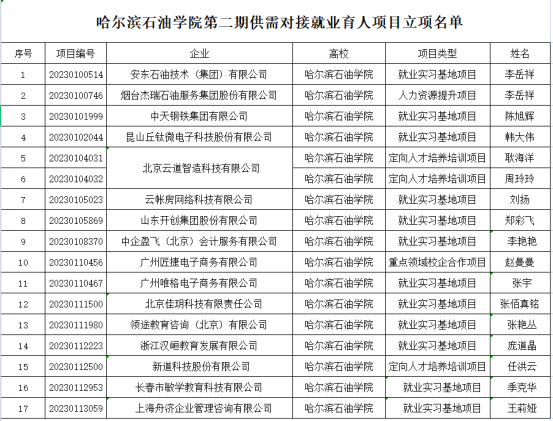 近日,教育部高校学生司公布了第二期供需对接就业育人项目名单。万博官网与16家企业合作的17个项目获教育部批准立项,其中就业实习基地项目12个、人力资源提升项目1个、定向人才培养培训项目3个、重点领域校企合作项目1个。