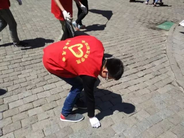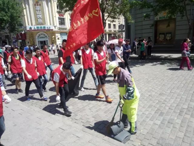 为了更好地完成志愿服务,志愿者们一大早就穿戴整齐来到阳光大厅集合。上午九点,在学生总会主席刘畅的带领下,二十四名志愿者身着红色的志愿马甲,手持垃圾袋,秩序井然的向中央大街走去。志愿者们清理的地方有很多都是环卫工人清理不到的“死角”,例如花坛、绿化带等。在志愿服务进行的时候,每一位志愿者都热情高涨,将近三个小时的徒步,没有一个人喊累,也没有一个人掉队。虽然天气炎热,但他们不怕脏,不怕累,认真地把垃圾清理干净。护航青春志愿服务队的同学们用自己的辛劳与汗水为哈尔滨市区整洁尽了自己的一份力量。