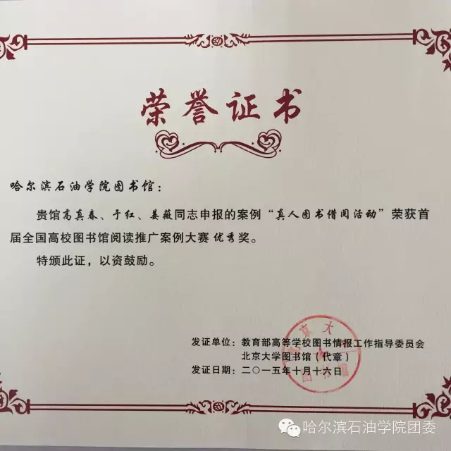 由教育部高等学校图书馆情报工作指导委员会读者服务创新与推广组主办,上海交通大学图书馆、上海财经大学图书馆、华中师范大学图书馆共同承办的首届全国高校图书馆阅读推广案例大赛全国总决赛于10月15-16日在华中师范大学成功召开,此次大赛共收到全国各省市高校图书馆推送的456个参赛案例,我院图书馆申报的阅读推广案例“真人图书借阅活动”经过黑龙江省分赛区、东三省分赛区的层层选拔,最终入选参加全国总决赛荣获大赛优秀奖,并参加决赛现场的海报展示。