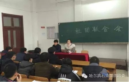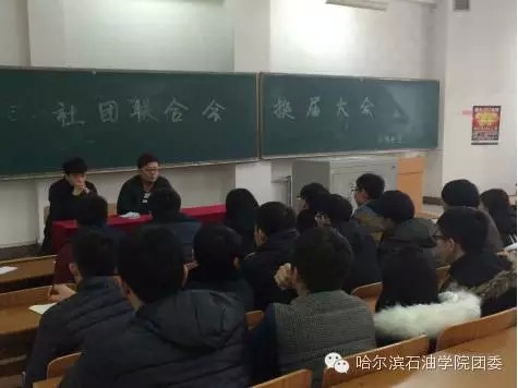 我院2015年12月9日举办2015~2016学年社联换届大会,团委书记王锦石、副书记周雪松、社团联合会主席王琦、社团联合会各部门部长及全体大二的参加了本次大会。