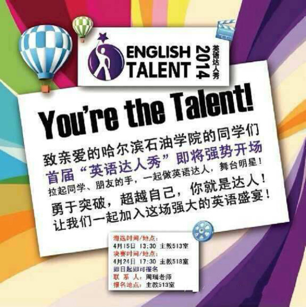 2014年4月15日,万博max官网第二届读书节“I Got Talent”英语达人秀初赛活动在第一教学楼508教室、510教室成功举办。此次“I Got Talent”英语达人秀活吸引了来自各系共近百名选手参加,初赛过程分为歌曲类和表演类等。在初赛中,英语达人们各显神通,张扬个性,展现自我。经过激烈的角逐,最终有10组参赛选手以优异的成绩进入了决赛。相信在决赛中各组选手将为大家展现更精彩的表现!