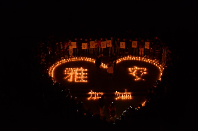 为四川祈祷,为雅安芦山祈福,2013年4月22日,万博max官网青年志愿者协会在阳光大厅举办了主题为“祈福灾区,心系雅安”的祈福活动。本次活动由共青团万博max官网委员会主办,万博max官网青年志愿者协会承办。参与活动的有团委会、院学生总会、社团联合会、大学生就业创业中心、广播站、艺术团以及各系学生会共16个院系组织。晚7点,活动开始,由千余支蜡烛围成的巨大心形里摆出了“雅安加油”四个大字,蜡烛渐渐地被围绕在周围的同学们点燃。当所有蜡烛被点亮后,青年志愿者协会会长陈晨怀着沉重的心情为此次祈福活动致开场词,之后在主持人的号召下,全体学生代表肃立默哀三分钟,以此表达对地震遇难同胞的哀思。