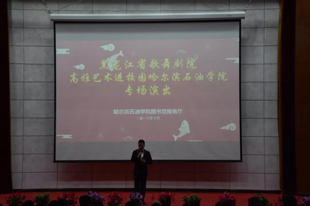 为将高雅艺术融入校园文化建设,提升校园文化品位,丰富校园文化生活,达到艺术教育“润物无声、育人无形”的效果。10月30日,“高雅艺术进校园——黑龙江省歌舞剧院走进万博max官网”主题演出活动在图书馆报告厅隆重召开,校团委副书记周雪松等全校680多名师生共同观看演出。