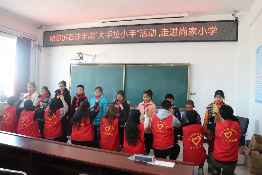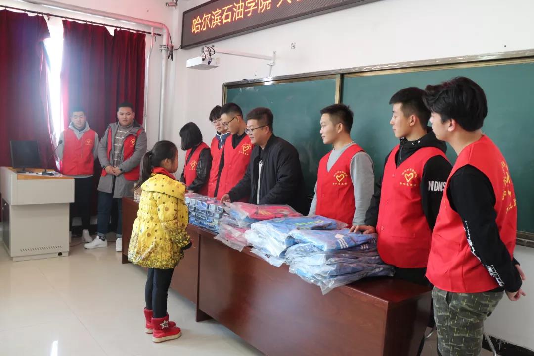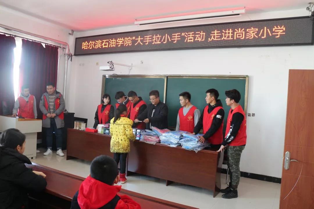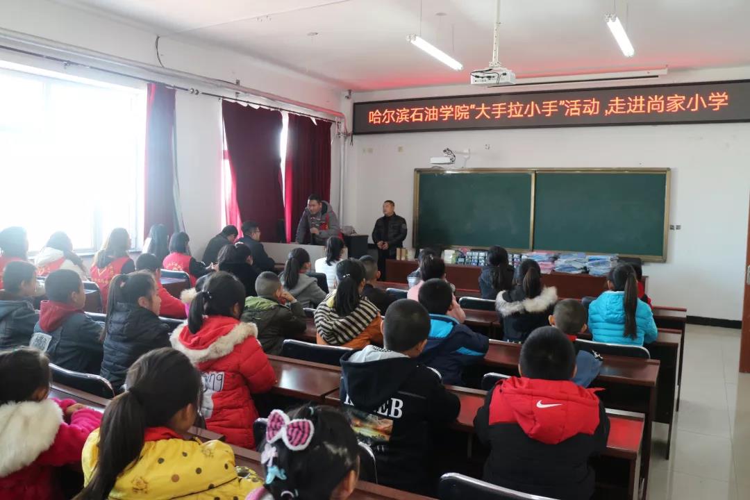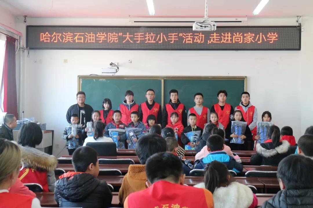 为积极贯彻落实党的十九大精神,根据省委高校工委、省教育厅下发的《关于开展高校大学生与农村留守儿童“大手拉小手”关爱行动实施方案》的部署安排,扎实做好留守儿童关爱保护工作,促进留守儿童健康成长,万博max官网于2018年11月13日在肇东市尚家小学开展以“大手拉小手,关爱留守儿童”为主题的帮扶活动。万博max官网团委书记王锦石、肇东市尚家小学副校长李瑞鹏,副校长司维明、尚家小学大队辅导员王立春及万博max官网30名志愿者和尚家小学受帮扶的留守儿童代表参加了此次活动。