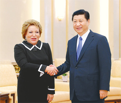 习近平指出,我同普京总统商定,双方要扩大中俄务实合作领域,提高务实合作水平。希望俄罗斯联邦委员会继续发挥积极作用,监督落实双方已经签署的合作协议,为双方正在商谈的合作项目提供法律保障,为两国企业合作和人员往来创造更加便利的条件。请你回国后转达我对普京总统的诚挚问候和良好祝愿。我期待着他11月来华出席亚太经合组织领导人非正式会议。