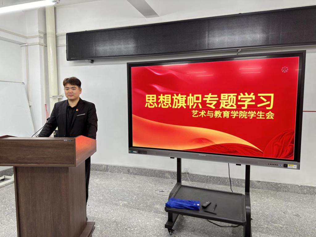 为深入学习贯彻习近平新时代中国特色社会主义思想,推动广大青年厚植红色信念,扎实推进开展习近平新时代中国特色社会主义思想主题教育,进一步提高我院学生会团支部成员的思想建设。艺术与教育学院学生会团支部于 2023年12月16日在艺术楼415 组织开展“思想旗帜”主题教育专题学习。艺术与教育学院学生会执行主席陈浩然同学为此次主题教育的领学人,我院学生会团支部全体成员参加。