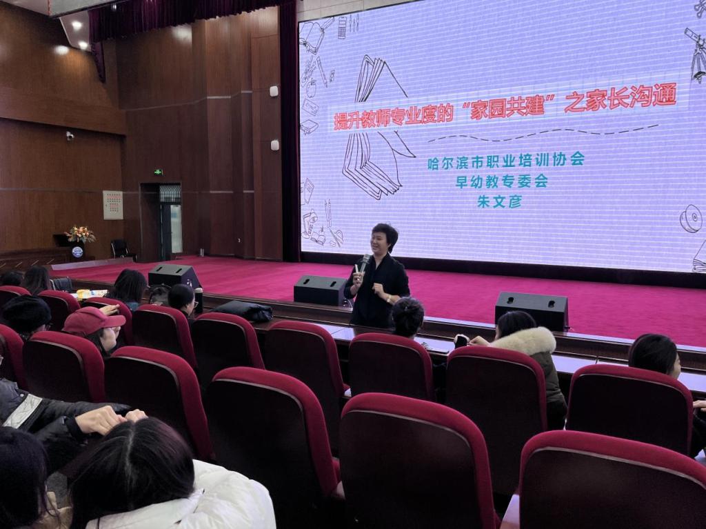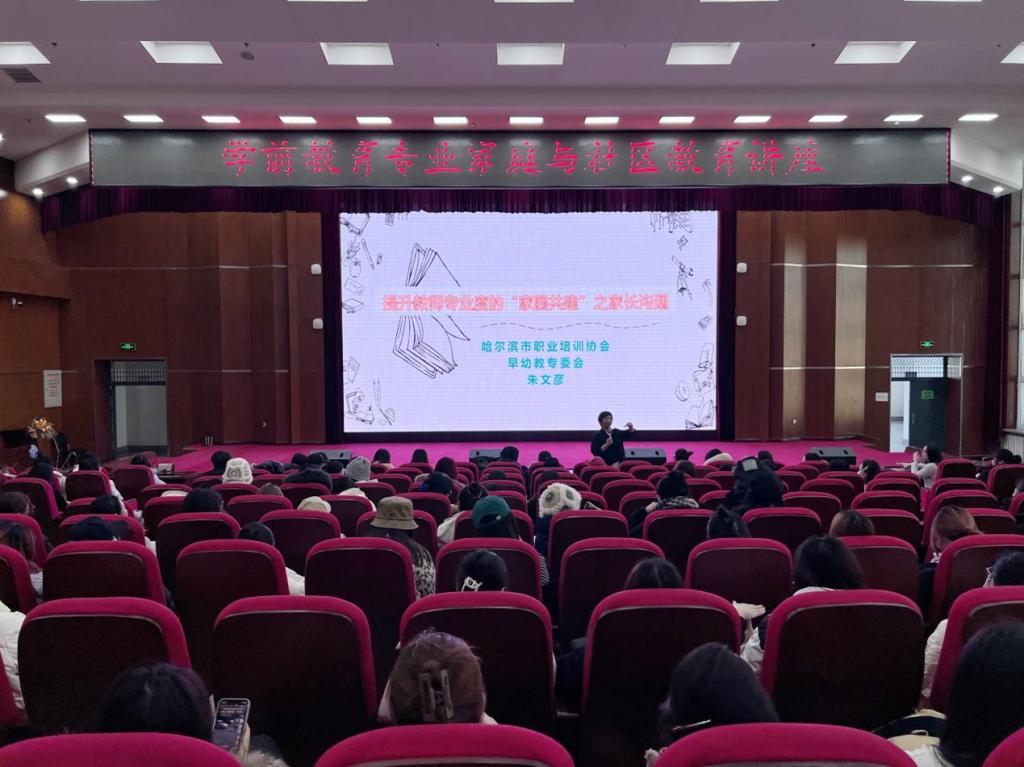 陈鹤琴先生曾说过:“幼儿教育是一件很复杂的事情,不是家庭一方面可以单独胜任的,也不是幼儿园一方面可以单独胜任的,必须两方共同合作才能得到充分的功效。”为进一步探索新时代“家园共建”新模式,提高艺术与教育学院学前教育系全体师生的家庭教育意识及家庭教育水平,促进家庭、学校、社会共同关注,进一步提升学前教育系全体师生的文化素养,为今后实习工作的顺利开展奠定基础,艺术与教育学院学前教育系于2023年12月12日在图书馆报告厅组织举办“提升教师专业度的‘家园共建’之家长沟通”讲座。本次讲座邀请到哈尔滨市职业培训协会早幼教专委会朱文彦老师进行主讲,艺术与教育学院学前教育系全体教师和2021级全体学生参加此次讲座。