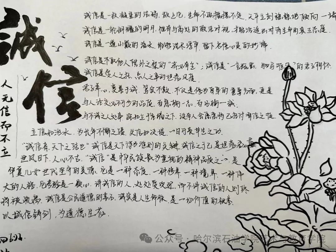 诚信是中华民族的传统美德,也是现代社会文明进步的重要标志。为了弘扬诚信精神,提高广大学生对诚信的认识和重视,引导学生树立诚信理念,培养诚信品质,激励学生以诚立世的奋发精神,营造积极、诚实、守信的文明之风,艺术与教育学院开展“心存诚信,处处感恩”手抄报绘画活动。