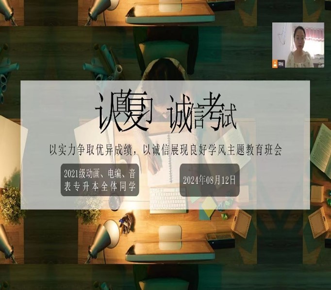 为进一步加强我院学风建设,培养学生诚信考试意识,提高学生思想道德修养,树立诚实守信的优良学风,营造公平公正的考风,艺术与教育学院于2024年8月10日-13日,各年级辅导员组织缓补考学生开展“考风考纪诚信教育”主题班会。