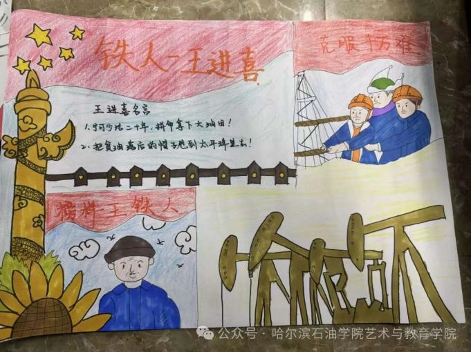 一幅幅画作仿佛将大家带回了那个艰苦卓绝的年代。有的作品描绘了王进喜在钻台上挥汗如雨、奋力拼搏的场景,有的则展现了他在恶劣环境中不屈不挠、勇往直前的精神风貌。每一幅作品都凝聚着作者对铁人精神的深刻理解和崇高敬意,也引发了学生们的强烈共鸣和深思。