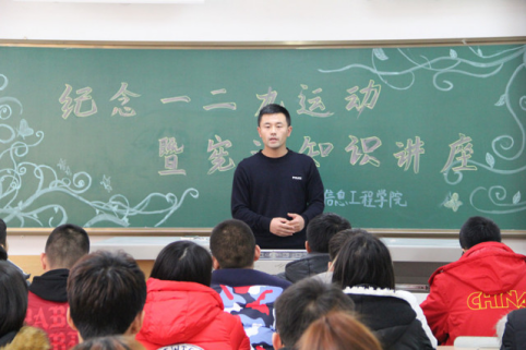 为宣传宪法知识,加强同学们的法律意识,做一个知法、守法的大学生。信息工程学院近日在二教405举行“纪念一二九运动暨宪法知识讲座”。信息工程学院辅导员张宏鹏参加并主持了此次活动。