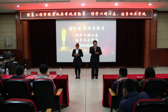 信息工程学院第九届“博学以明心智,洁身而立学风”为主题的学风考勤月颁奖晚会近日在主教518圆满落幕。本次晚会的成功举办,为期一个月的学风考勤月活动画上了圆满的句号。信息工程学院党总支书记苏永彬,院辅导员张宏鹏,15届主席团及16级全体学生出席本次活动。