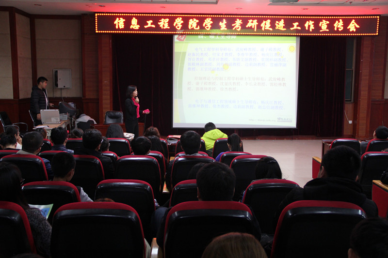 为促进学院考研工作,帮助学生对考研信息的了解,加强考研宣传,营造良好的学风、浓厚的考研氛围,加强考研指导和服务,10月25日,信息工程学院在主教518报告厅召开了学生考研促进宣传会。信息工程学院副院长朱佳梅、各系主任、辅导员以及全体2014级学生出席会议。