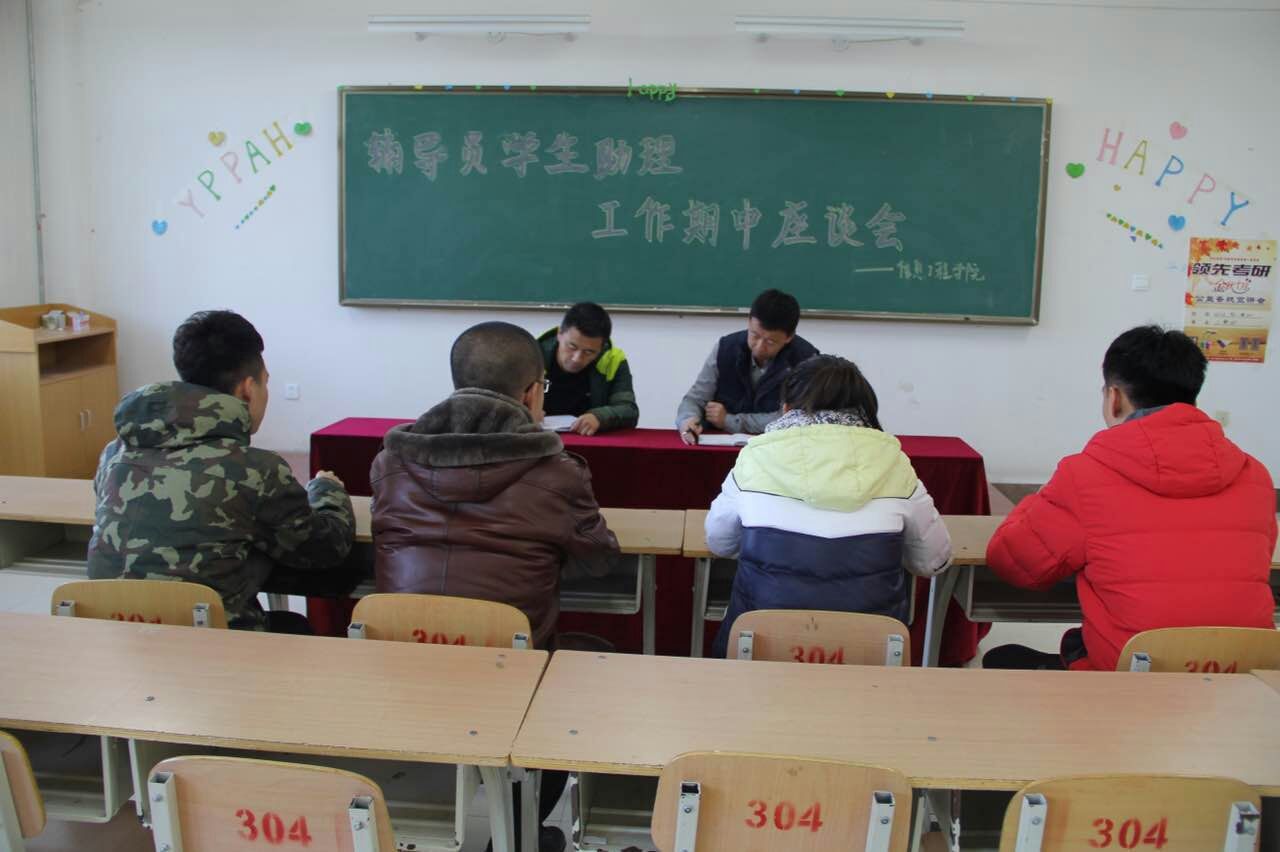 为进一步加强改进我学院辅导员助理队伍的建设,同时提高学院的凝聚力与战斗力。充分听取各年级辅导员助理对学院工作意见,信息工程学院于2016年10月20日在二教304召开了“辅导员学生助理工作座谈会”。信息工程学院党总支副书记苏永彬老师,辅导员张宏鹏老师及四位辅导员助理出席了本次会议。