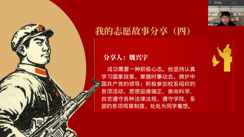 会议中,四位志愿者分享了他们利用寒假实践,积极地参与到社区疫情防控志愿队伍中,遇见了一件又一件感人暖心的故事,以及许多前辈在抗疫前线无私奉献的所见所闻。志愿者们这些难忘的人生经历与人生感悟,让同学们深感人间温暖。