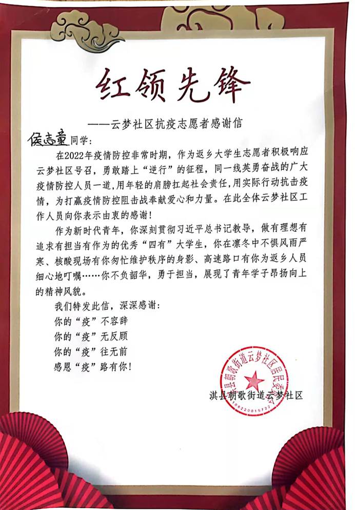 她坚信:“共同战疫,抗疫有我,在这场阻击战中,我们当以奉献诠释信念、以行动彰显忠诚、以初心不变担当使命,书写新时代雷锋故事的生动篇章,彰显“奉献、友爱、互助、进步”的志愿服务精神,充分展现青年志愿者勇挑重担、乐于奉献的扎实作风和朝气蓬勃、吃苦耐劳的精神面貌,让祖国,人民认同我,让祖国和人民相信有我们明天会更好。”侯志童同学主动到社区参加志愿服务活动,用实际行动完美诠释了一名大学生的青春靓丽本色.