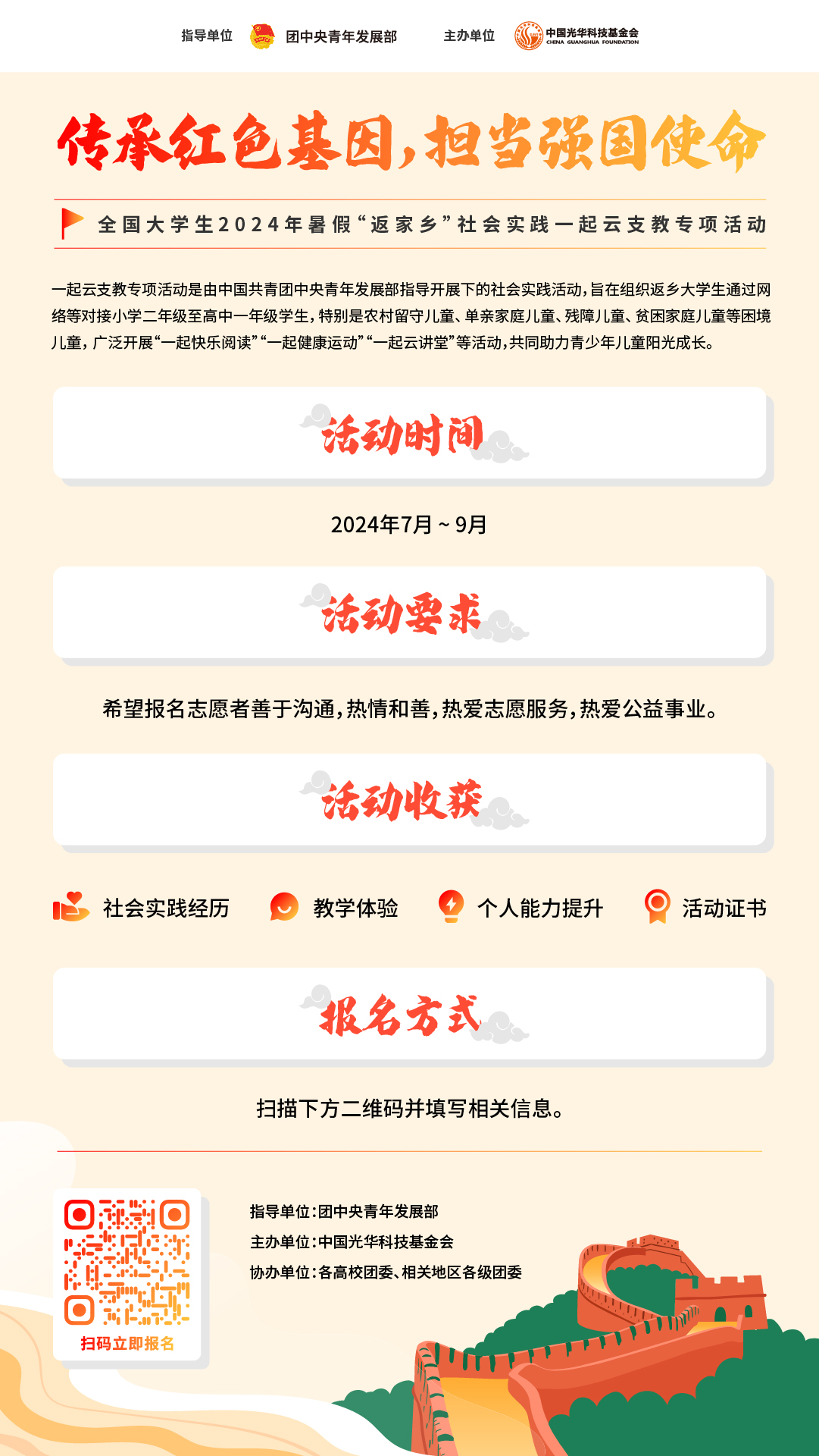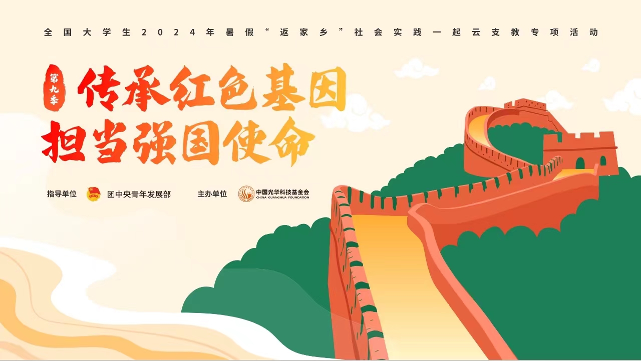 在团中央青年发展部的悉心指导下,今年暑假,中国光华科技基金会决定开展“传承红色基因 担当强国使命”全国大学生2024年暑假“返家乡”社会实践“一起云支教”第九季专项活动。我们诚挚地邀请广大大学生志愿者踊跃报名,携手前行,继续为偏远地区的孩子们带去知识和温暖,为国家的发展贡献青春力量。活动安排如下: